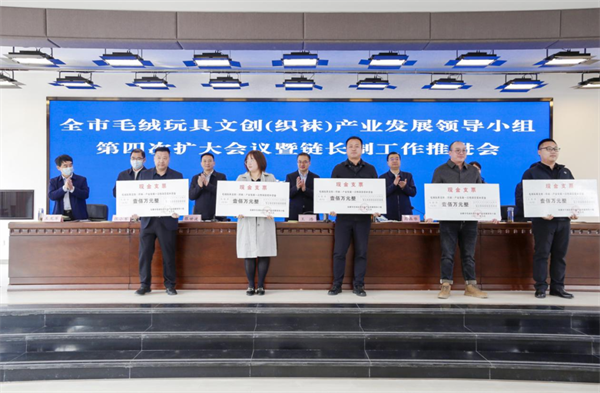 2022年10月18日,全市毛絨玩具文創(chuàng)(織襪)產(chǎn)業(yè)發(fā)展領(lǐng)導小組第四次擴大會議上表彰兌現(xiàn)了一次性獎補資金1000萬元