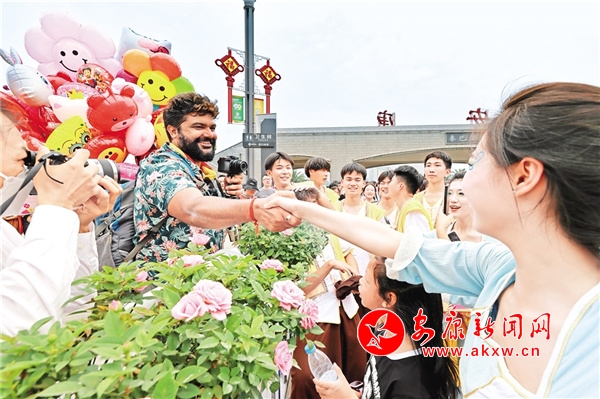 6月22日,來(lái)自印度的游客Ramm在觀看完龍舟節(jié)開幕式后與演職人員合影。記者 潘潤(rùn)生 攝
