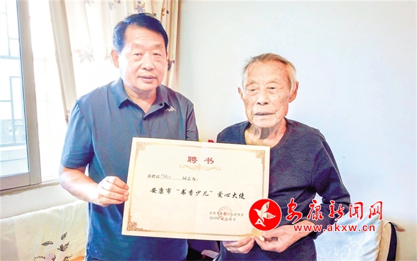 安康市書香少兒讀書會負責人李煥龍為鄺民三送上“愛心大使”聘書。