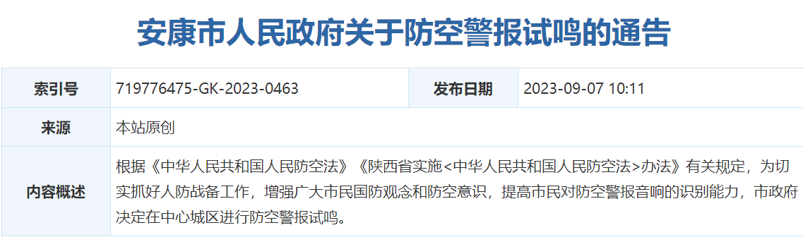 安康市人民政府關(guān)于防空警報試鳴的通告