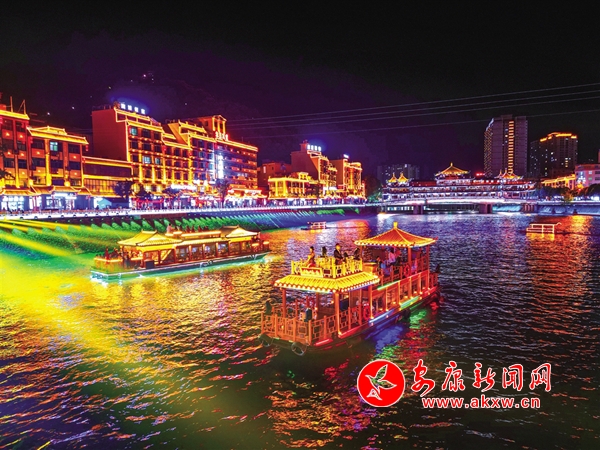 賽場內(nèi)氣氛熱烈,激情昂揚(yáng);賽場外活動多樣,異常精彩。賽事期間,嵐皋化身“不夜城”,琉璃燈火,璀璨夜色。每天傍晚,嵐皋“硒旺”號畫舫乘著晚風(fēng)從碼頭緩緩出發(fā),在燈光輝映下流光溢彩,船上輕歌曼舞,為槳聲燈影里的嵐河平添了一道水上流動風(fēng)景。嵐河兩岸紛紛開展各具特色的文旅活動,“嵐河夜畫”燈光秀把縣城裝扮得斑斕夢幻,花燈祈福、龍舟競渡等水上項(xiàng)目供游客參與體驗(yàn),cosplay、漢服、西游等主題巡游,處處飄蕩著歡聲笑語,各地游客在欣賞賽事的同時,享受到更多豐富多彩的娛樂生活。拍照、直播、發(fā)朋友圈,據(jù)不完全統(tǒng)計(jì),賽事及相關(guān)活動吸引860余萬網(wǎng)民圍觀。