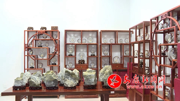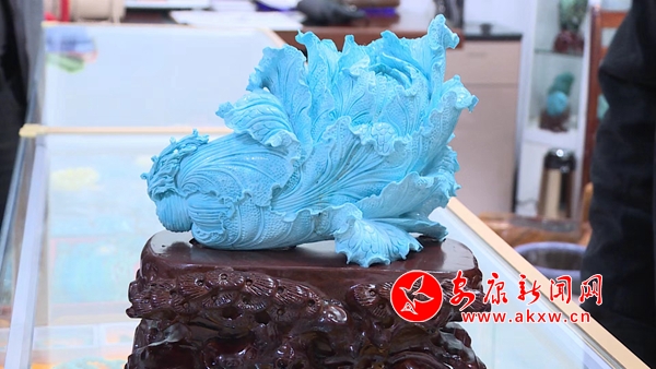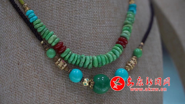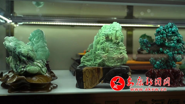 松石展柜中,擺放著各類精致時尚的綠松石飾品,這些通過雕刻家設(shè)計打磨后的擺件、項鏈、手鏈、耳墜等,都是藝術(shù)臻品,它們吸引著人們的目光,讓人愛不釋手。