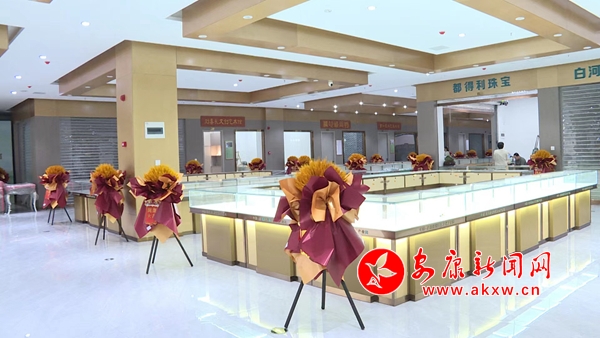 接待大廳的工作人員熱情洋溢,商家們正滿臉喜氣地懸掛牌匾、有的正在擺放各種造型美觀的綠松石擺件,還有的則正在和顧客交流甚歡。