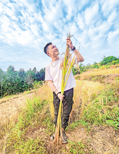 “巨型稻”比身高1.8米小伙子還高一點(diǎn)。