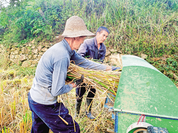 本網(wǎng)訊(記者 楊遷偉 孫妙鴻)風(fēng)吹稻田千重浪,又到一年秋收時(shí)。10月13日,記者來到漢陰縣蒲溪鎮(zhèn)盤龍村試種的90余畝“巨型稻”試驗(yàn)田,層層疊疊的稻田一片金黃,一株株高大的“巨型稻”傲然挺立,“個(gè)頭”明顯比旁邊稻田里普通水稻高出許多,長而飽滿的稻穗低垂著迎風(fēng)搖擺,村民們正搶抓晴好天氣,加緊收割。