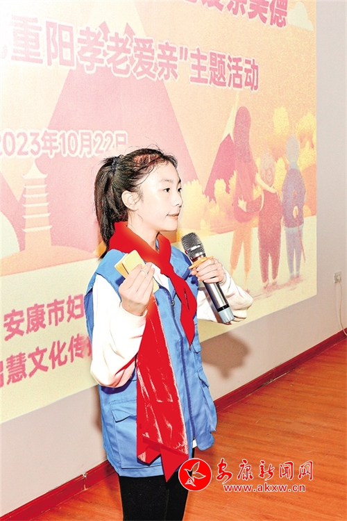 為弘揚中華民族傳統(tǒng)美德,營造尊老、愛老濃厚氛圍,在10月22日重陽節(jié)即將來臨之際,安康日報社開展“九九重陽 孝老愛親”主題活動。本次活動由安康市關心下一代工作委員會、安康市婦女聯(lián)合會、安康日報社主辦,安康少年新聞學院、安康金州啟慧文化傳播有限公司承辦;顒又械氖謩菸璞硌荨吨腥A孝道》、互動游戲《拍拍操》、分享重陽糕、茶藝表演及為老人奉茶等環(huán)節(jié),讓現(xiàn)場每個人感受到了濃濃的節(jié)日氛圍。(記者 潘潤生 攝影報道)