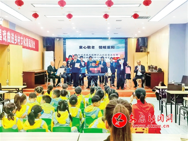 白河縣獅子山社區(qū)聯(lián)合城關(guān)鎮(zhèn)中心幼兒園舉辦“童心敬老情暖重陽”主題活動。黃秀琴 攝
