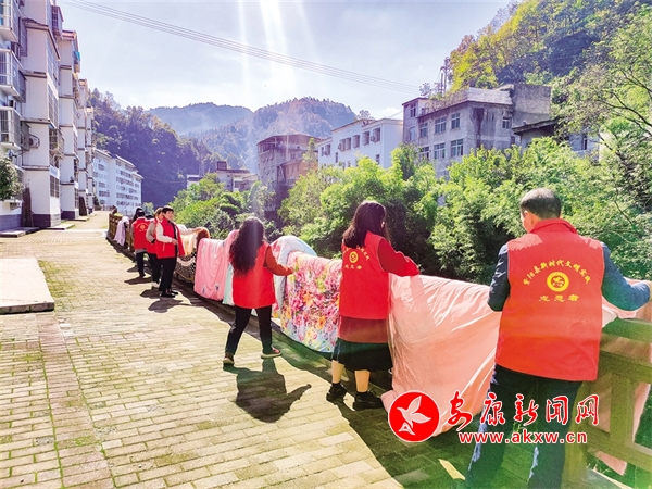 紫陽縣高橋鎮(zhèn)桂花樹社區(qū)組織新時代文明實踐志愿者服務(wù)隊,幫助社區(qū)行動不便的獨居老人、殘疾人曬被子、裝過冬棉被。胡波 王順勤 攝