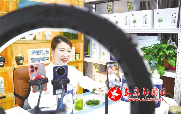 “平利漫山遍野都有絞股藍,絞股藍有‘東方神草’之稱,含有豐富的皂苷、黃酮、多糖類化合物,富有鋅、硒等多種微量元素,對人體有諸多好處。”11月5日,在第六屆中國進出口博覽會陜西館,平利縣富硒堂茶業(yè)有限公司負責人王秀梅向客商推薦介紹平利絞股藍。與此同時,在位于平利縣數(shù)字經濟產業(yè)園里的公司直播間,員工成云正在進行著絞股藍產品的直播售賣。