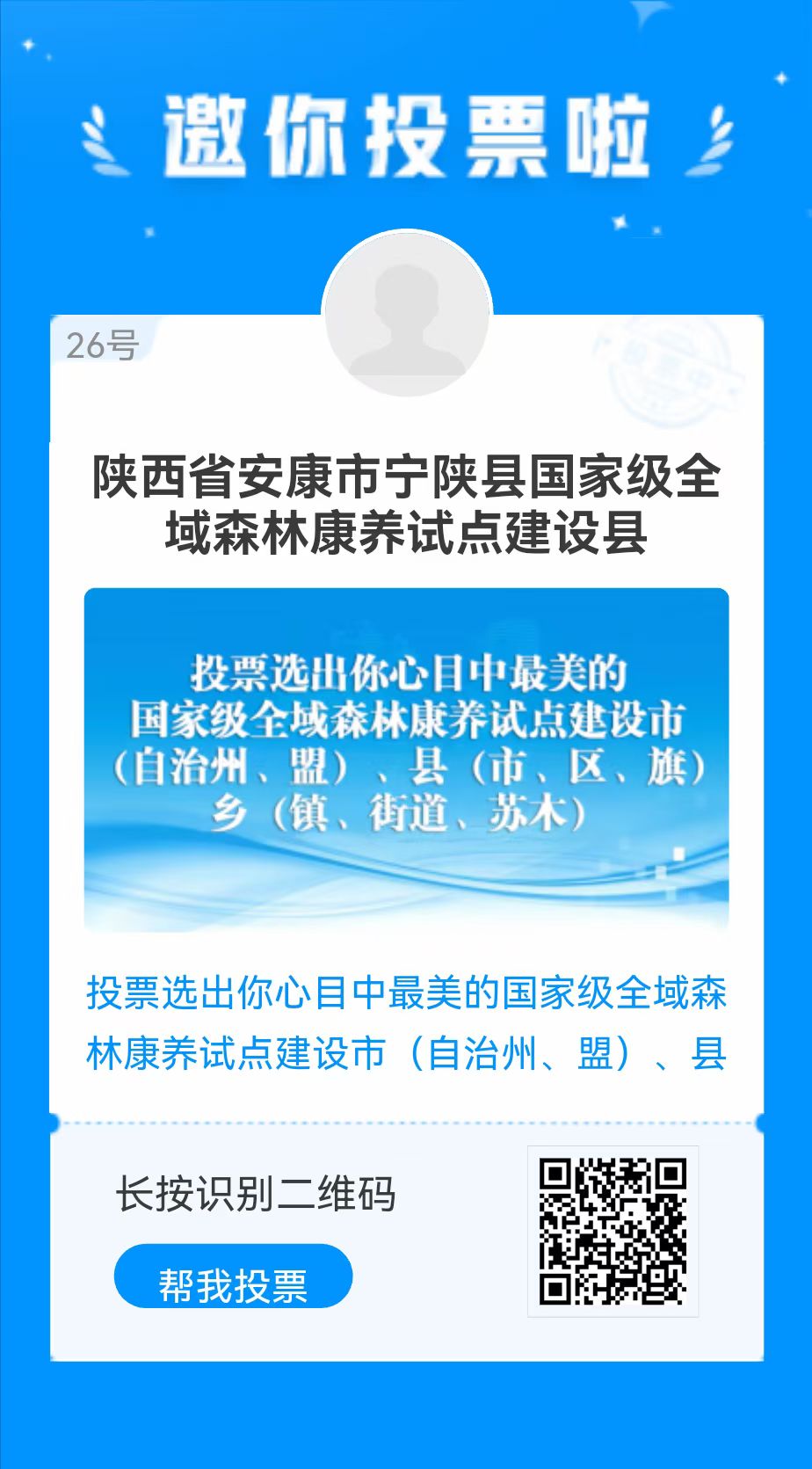 據(jù)了解,國(guó)家級(jí)森林康養(yǎng)試點(diǎn)建設(shè)單位認(rèn)定工作由中國(guó)林業(yè)產(chǎn)業(yè)聯(lián)合會(huì)負(fù)責(zé)開(kāi)展,經(jīng)自愿申報(bào)、主管部門審核推薦、合規(guī)用地和安全經(jīng)營(yíng)專項(xiàng)檢查、當(dāng)?shù)毓、專家審查及認(rèn)定結(jié)果全國(guó)公示等程序,確定了2023年國(guó)家級(jí)森林康養(yǎng)試點(diǎn)建設(shè)單位名單。同時(shí)還開(kāi)設(shè)投票活動(dòng),選出大眾心目中最美的國(guó)家級(jí)森林康養(yǎng)試點(diǎn)建設(shè)基地和中國(guó)森林康養(yǎng)人家,請(qǐng)為森林履蓋率全國(guó)第一的“秦嶺之心 綠都寧陜”投上您寶貴的3票!(長(zhǎng)按二維碼即可投票,每個(gè)微信號(hào)每天可投3票)
