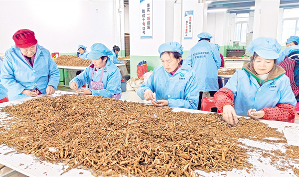 村民們處理挖掘出來的野生葛根,這批野生葛根即將交售給陽(yáng)弘潤(rùn)本草中藥材發(fā)展有限公司