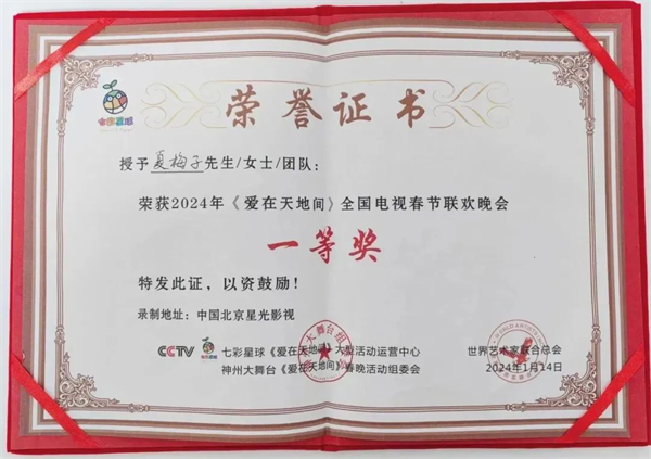 1月15日,《愛在天地間》全國電視春節(jié)聯(lián)歡晚會在京錄制圓滿成功。晚會由劉相周擔(dān)任總導(dǎo)演,邀請有春雷、王琪、烏蘭托婭、夏梅子等多位嘉賓,分別表演了多個精彩節(jié)目。夏梅子在這次晚會上演唱了陜南民歌《幸福歌兒唱安康》并榮獲一等獎。