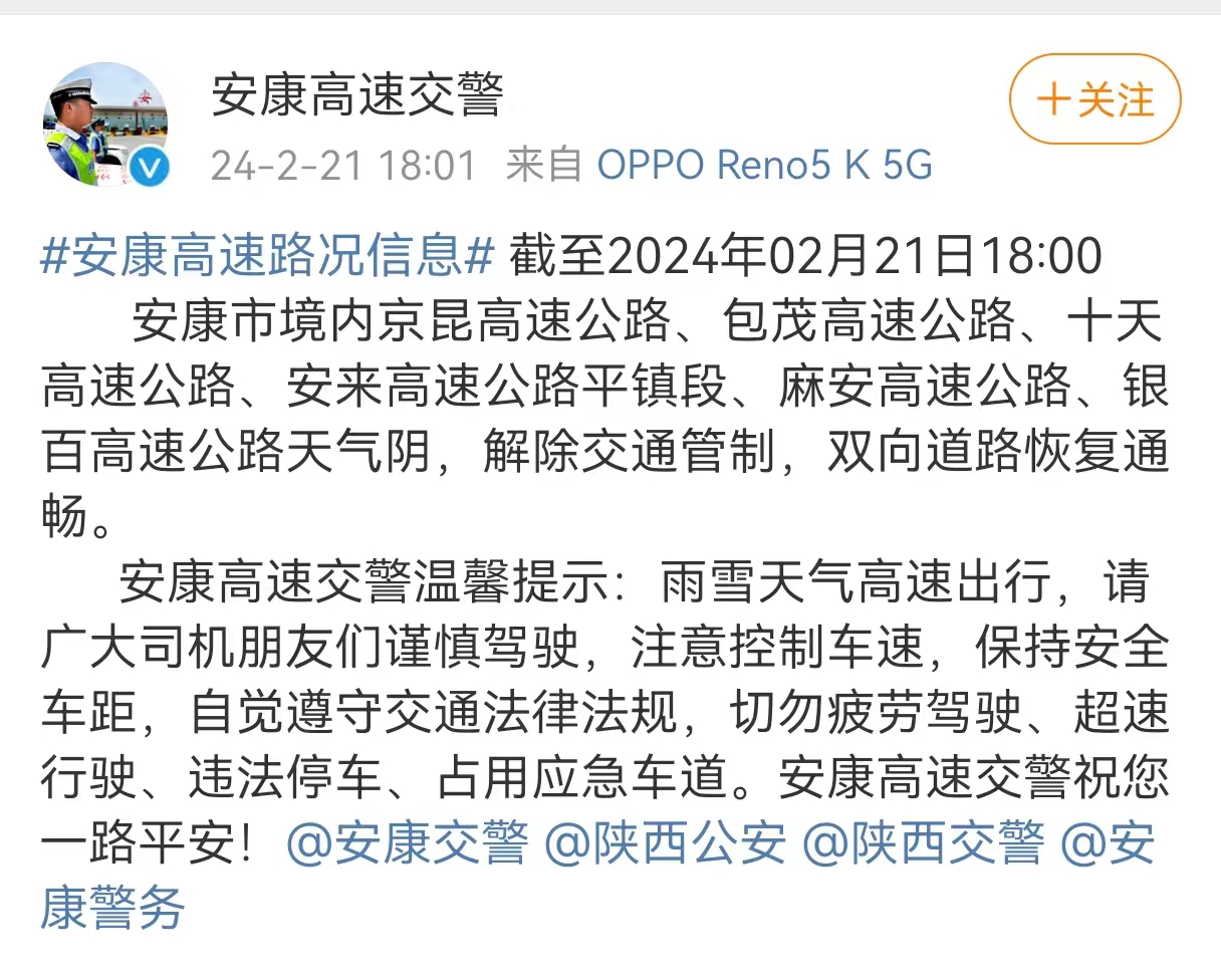 2月21日18時,安康高速交警發(fā)布消息:截至2024年02月21日18:40,安康市境內(nèi)京昆高速公路、包茂高速公路、十天高速公路、安來高速公路平鎮(zhèn)段、麻安高速公路、銀百高速公路天氣陰,解除交通管制,雙向道路恢復(fù)通暢。 禁止;愤\(yùn)輸車輛和七座以上客車駛?cè)敫咚佟?span style="display:none">ric安康新聞網(wǎng)