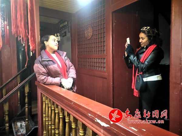“千門萬戶曈曈日,總把新桃換舊符。”中國春節(jié),是從貼春聯(lián)開始的,4名留學生來到老城街道辦土地樓一處老房子,在主人的熱情接待下,他們參觀了這座始建于清末民初的全磚木結(jié)構(gòu)古建筑。留學生們被老房子中的一草一木所吸引,感受著歲月的痕跡和安康民居的獨特韻味。“真的很難想象,這棟建筑有超過150年的歷史,這是怎么建造的呢?”來自埃塞俄比亞的留學生梅昕對這樣的古建筑充滿了好奇。在社區(qū)工作人員的幫助下,留學生們?yōu)槔险合屡f桃符,貼上新春聯(lián),共同體驗了春節(jié)的“辭舊迎新”之意。