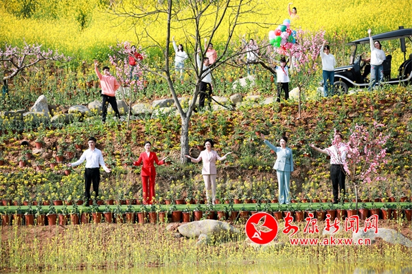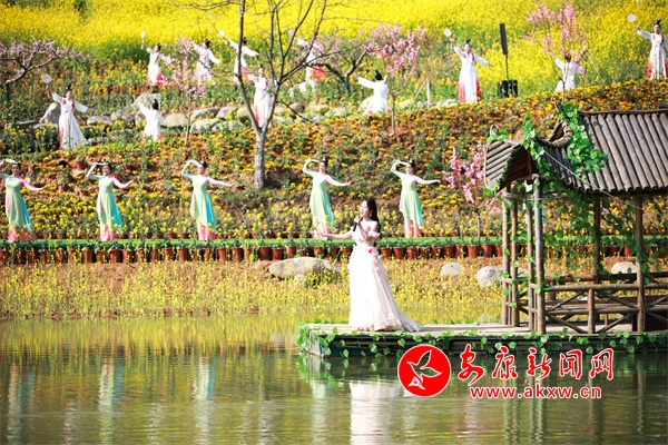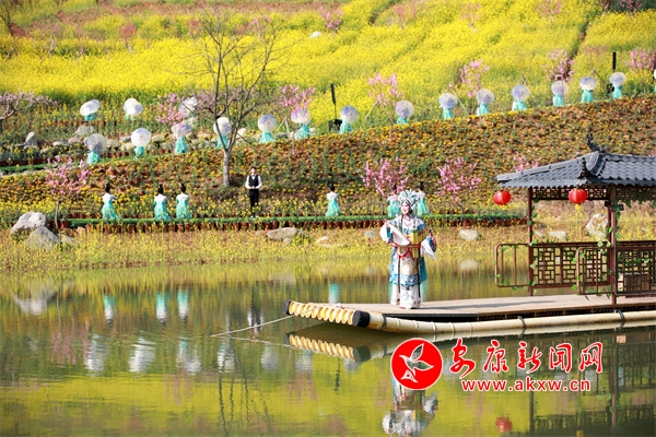 春日的水田溝村生機勃發(fā),漫山的油菜花在暖陽下爭相怒放,山坡下是一汪清澈的湖水;顒右郎骄蛣、水陸并用,將演員、舞臺、道具與水田溝村地形地貌完美融合,營造出“人在畫中游,畫在景中走”的和美景象。隨著原創(chuàng)歌曲《水田溝的油菜花》悠揚動聽的歌聲從湖面的小船傳來,活動正式拉開帷幕,獨唱《問春》、情景詩朗誦《母親河》、歌伴舞《醉美桃花源》、情景劇《桃花源記》、漢劇歌舞《喬木花》、原創(chuàng)歌曲《阿依娜》、歌伴舞《幸福安康》等精彩節(jié)目相繼上演,悠揚的歌聲、曼妙的舞姿在湖上、在油菜花田、在蜿蜒的山路漸次呈現(xiàn),將現(xiàn)場觀眾和游客迅速帶入安康桃花源美麗夢幻的油菜花海世界,沉浸式感受安康高新區(qū)產(chǎn)城綠融合發(fā)展和鄉(xiāng)村振興的顯著成效。