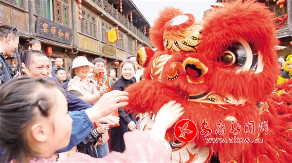 “五一”小長(zhǎng)假期間,漢陰縣雙河口古鎮(zhèn)景區(qū)吸引了大批游客前來(lái)游玩打卡。圖為游人欣賞舞獅表演。王建霞 攝
