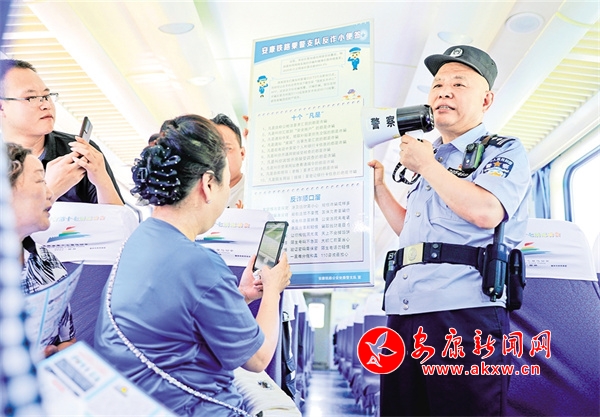 “我已經發(fā)展了三個志愿者!”老范一邊興高采烈地說著,一邊從他的工作包中找出志愿者袖標及徽章。就在剛才,在站臺上引導旅客上車的老范憑著自己的親和力,很快就物色了幾名自愿擔任平安列車志愿者的旅客。老范隨后給志愿者佩戴袖標及徽章,給他們開展崗前培訓,帶他們在列車上開展反詐和防盜等安全宣傳。