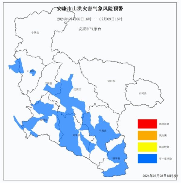 本網(wǎng)訊 7月8日16時,安康市水利局、市氣象局聯(lián)合發(fā)布山洪災害氣象風險預警:預計,7月8日16時至7月9日16時,漢濱區(qū)中部、漢陰縣東部、石泉縣中部、紫陽縣、嵐皋縣、平利縣中部、鎮(zhèn)坪縣中南部有可能發(fā)生山洪災害(藍色預警)。 USc安康新聞網(wǎng)
