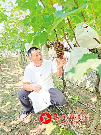 2016年,吳世銀開始嘗試在本地小范圍種植葡萄,2019年10月,在該鎮(zhèn)大力支持下開始發(fā)展山地葡萄種植,并成立家庭農(nóng)場。經(jīng)過8年持續(xù)發(fā)展,他的基地從最開始只有一個夏黑品種發(fā)展至現(xiàn)在5個品種,目前種植規(guī)模40余畝,年產(chǎn)值達60萬元。