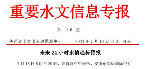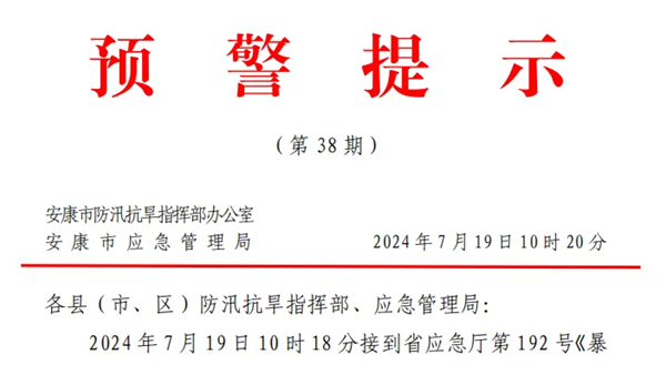 2024年7月19日10時(shí)18分接到省應(yīng)急廳第192號(hào)《暴雨橙色預(yù)警》:預(yù)計(jì)未來(lái)3小時(shí)我市漢濱區(qū)、寧陜縣降雨量將達(dá)50 毫米以上,未來(lái)6小時(shí)我市漢陰縣、石泉縣、旬陽(yáng)市、白河縣將達(dá)50毫米以上,以上地區(qū)境內(nèi)發(fā)生山洪、泥石流等災(zāi)害風(fēng)險(xiǎn)較高。