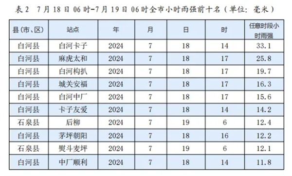 2024年7月18日白天我市大部出現(xiàn)陣雨天氣,19日05時(shí)起我市西部出現(xiàn)較強(qiáng)降水天氣。據(jù)統(tǒng)計(jì),2024年7月18日06時(shí)至7月19日06時(shí)安康市平均雨量為6.1毫米,其中單站雨量最大為白河卡子氣象監(jiān)測(cè)站48.4毫米,縣市平均雨量最大為白河縣15.3毫米,最大小時(shí)雨強(qiáng)出現(xiàn)在白河卡子氣象監(jiān)測(cè)站33.1毫米(18日13時(shí)-14時(shí))。全市共有235個(gè)站出現(xiàn)了降雨(大于0.1毫米),10毫米(中雨)以上有41站,25毫米(大雨)以上有8站。共有16站次小時(shí)雨強(qiáng)超過(guò)10毫米,2站次小時(shí)雨強(qiáng)超過(guò)20毫米。