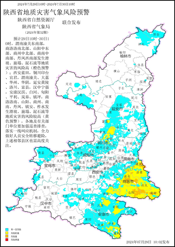 陜西省自然資源廳與陜西省氣象局聯(lián)合發(fā)布地質(zhì)災(zāi)害氣象風(fēng)險(xiǎn)預(yù)警:7月29日10時(shí)至7月30日10時(shí),下圖所示縣(區(qū))可能發(fā)生地質(zhì)災(zāi)害:其中我市漢濱、白河、旬陽、平利、嵐皋、鎮(zhèn)坪發(fā)生滑坡、崩塌、泥石流等地質(zhì)災(zāi)害的風(fēng)險(xiǎn)較高(黃色預(yù)警),各地及有關(guān)部門單位要加強(qiáng)巡查排查,落實(shí)一線叫應(yīng)機(jī)制,全力做好人員安全轉(zhuǎn)移避險(xiǎn),上述相鄰縣區(qū)也需高度關(guān)注。