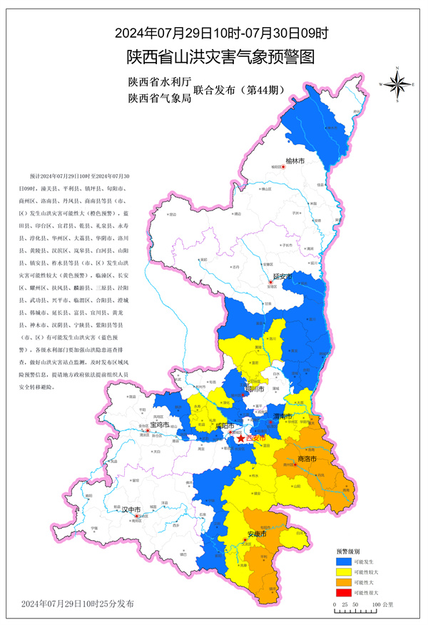 陜西省水利廳與陜西省氣象局聯(lián)合發(fā)布山洪災(zāi)害氣象預(yù)警:預(yù)計(jì)7月29日10時(shí)至7月30日9時(shí),下圖中所示縣(區(qū))可能發(fā)生山洪災(zāi)害,其中我市漢濱區(qū)、嵐皋縣、白河縣發(fā)生山洪災(zāi)害可能性較大(黃色預(yù)警),漢陰縣、寧陜縣、紫陽縣有可能發(fā)生山洪災(zāi)害(藍(lán)色預(yù)警),各級水利部門要加強(qiáng)山洪隱患巡查排查,做好山洪災(zāi)害站點(diǎn)監(jiān)測,及時(shí)發(fā)布區(qū)域風(fēng)險(xiǎn)預(yù)警信息,地方政府應(yīng)依法提前組織人員安全轉(zhuǎn)移避險(xiǎn)。
