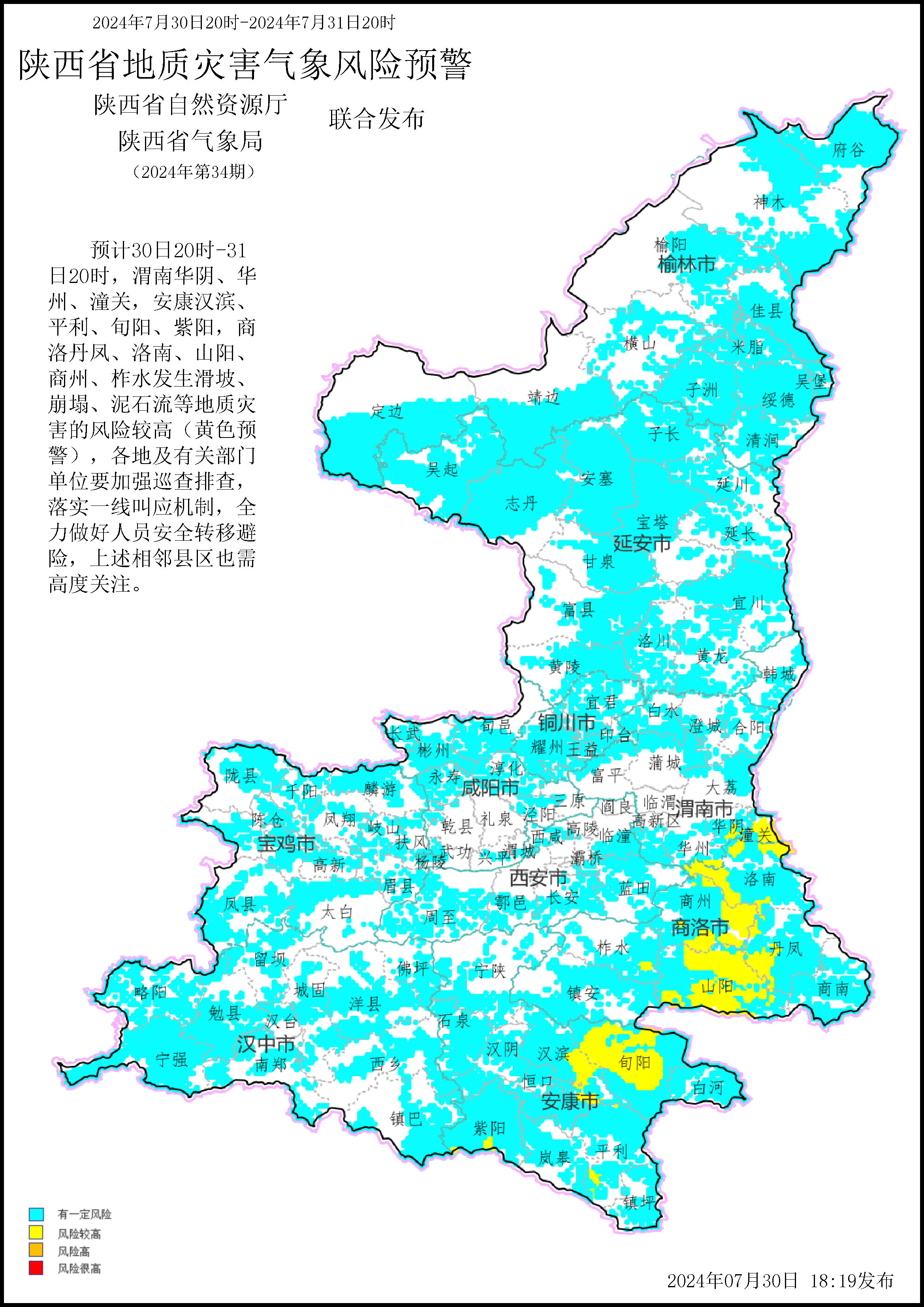 陜西省自然資源廳與陜西省氣象局聯(lián)合發(fā)布地質(zhì)災(zāi)害氣象風(fēng)險(xiǎn)預(yù)警:預(yù)計(jì)2024年7月30日20時(shí)—31日20時(shí),渭南華陰、華州、潼關(guān),安康漢濱、平利、旬陽、紫陽,商洛丹鳳、洛南、山陽、商州、柞水發(fā)生滑坡、崩塌、泥石流等地質(zhì)災(zāi)害的風(fēng)險(xiǎn)較高(黃色預(yù)警),各地及有關(guān)部門單位要加強(qiáng)巡查排查,落實(shí)一線叫應(yīng)機(jī)制,全力做好人員安全轉(zhuǎn)移避險(xiǎn),上述相鄰縣區(qū)也需高度關(guān)注。