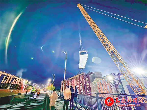 11月26日零點(diǎn)左右,七里溝立交主線鋼箱梁第一榀架設(shè)。