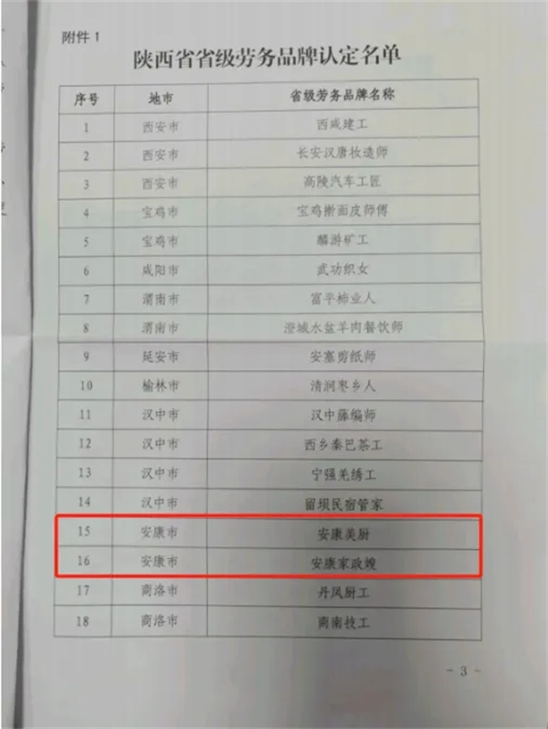 12月3日,陜西省人力資源和社會保障廳、陜西省財(cái)政廳公布2024年陜西省省級勞務(wù)品牌認(rèn)定名單及2024年陜西省省級勞務(wù)品牌引領(lǐng)單位認(rèn)定名單,我市兩個(gè)勞務(wù)品牌——安康美廚、安康家政嫂,兩家勞務(wù)品牌引領(lǐng)單位——陜西禹金洲餐飲管理有限公司、陜西康嫂家政服務(wù)有限公司分別入選。