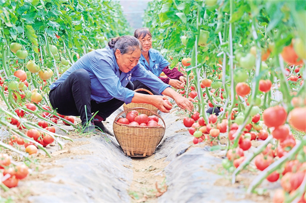農民在秦葉情現代農業(yè)園區(qū)采摘西紅柿