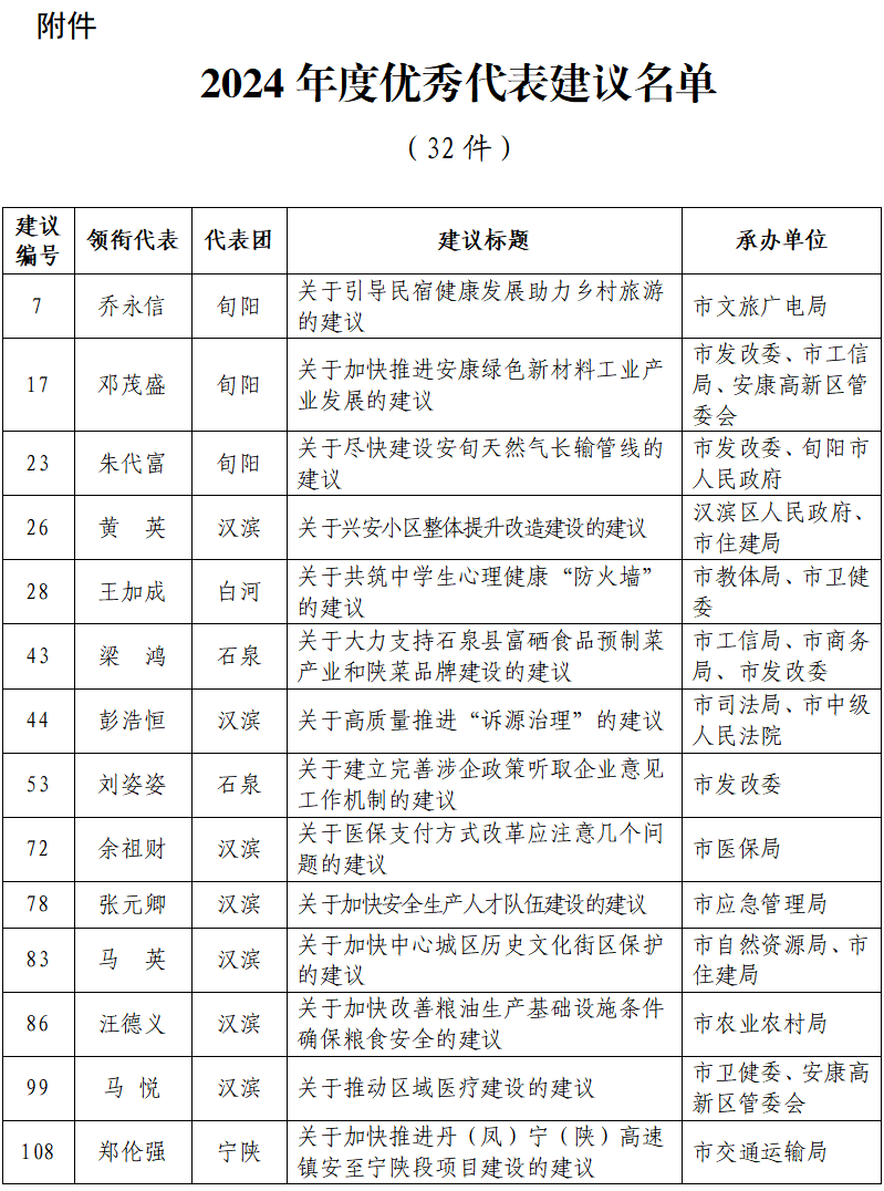 市五屆人大五次會議以來,全體市人大代表緊緊圍繞全市中心工作和人民群眾普遍關心關注的熱點難點問題,依法履行職責,積極建言獻策,共提出了256件代表建議,這些建議主題明確具體、建議切實可行、行文簡潔規(guī)范、效果可期可見,為推進我市經濟社會發(fā)展和民主法治建設凝聚了智慧、增進了共識、貢獻了力量。為樹立典型、推進工作,市人大常委會決定,對喬永信等代表提出的32件優(yōu)秀代表建議予以通報表揚。
