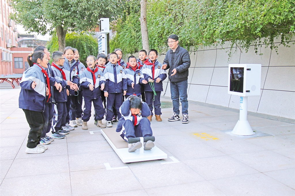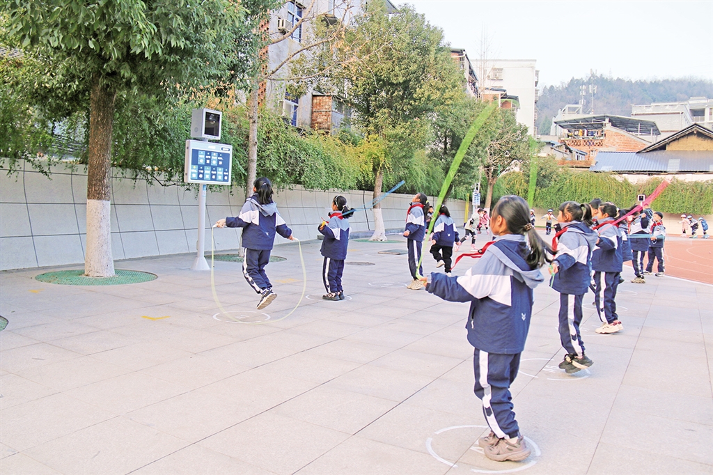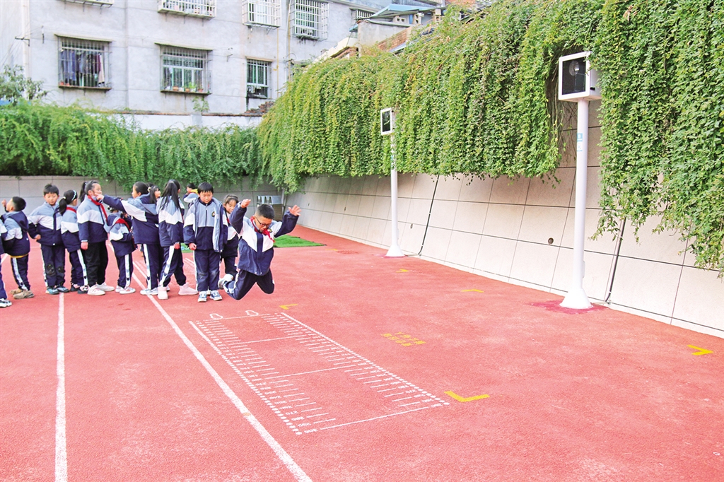 學(xué)生在AI智慧體育運(yùn)動(dòng)儀器感應(yīng)區(qū)內(nèi)跳繩。
