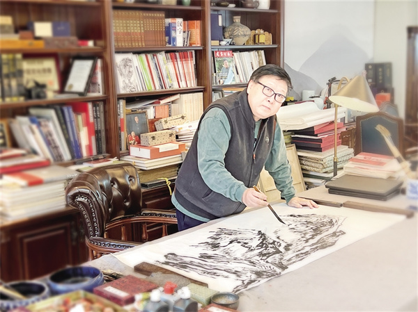 在安康,穆家善這樣介紹他最得意的焦墨千毫皴:“我創(chuàng)作的焦墨千毫皴,就是改變了傳統(tǒng)的毛筆的使用方法,用西方的一種藝術觀點來說,一種畫風的改變或者一種畫技的改變,其實就是一種新的思想和流向,我的千毫皴,作畫時千豪齊發(fā)的感覺,正好符合今天我們中國人的時代精神,有一種自毫感和幸福感。我們中國傳統(tǒng)文化追求天人合一,我覺得作畫追求的最高境界就是靜,我也希望自己的作品能給受眾一種安靜和諧的意味,這也正是中國傳統(tǒng)文化的精髓所在。”