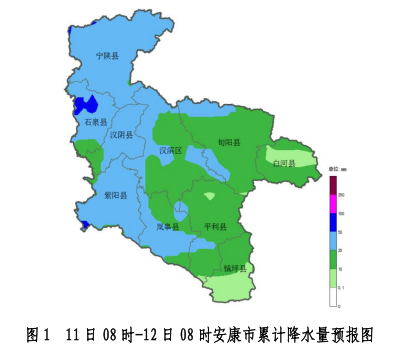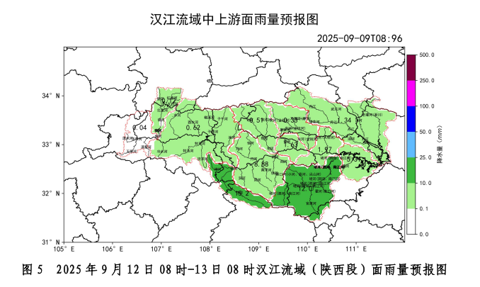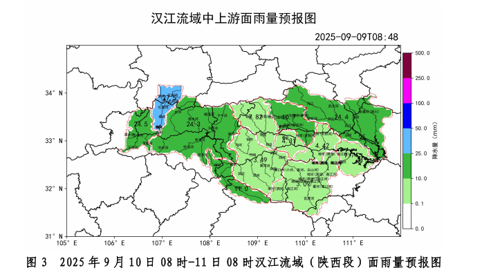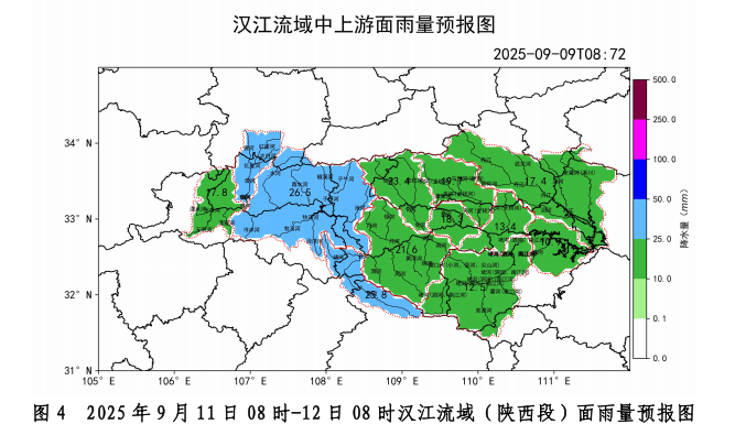 預(yù)計(jì)10日08時(shí)-11日08時(shí)漢江流域(陜西段)大部面雨量0.1~10毫米,玉帶河、酉水河、子午河、任河流域面雨量10-25毫米,褒河流域面雨量25-50毫米(圖3);11日08時(shí)-12日08時(shí)漢江流域(陜西段)褒河、酉水河、子午河、任河面雨量25~50毫米,其余中小河流流域面雨量10~25毫米(圖4);12日08時(shí)-13日08時(shí)漢江流域(陜西段)任河、堵河流域面雨量達(dá)10~25毫米,其余中小河流流域面雨量0.1~10毫米(圖5)。