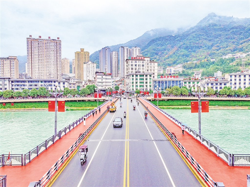 在嵐皋縣大橋兩側(cè),一面面整齊的五星紅旗迎風(fēng)飄揚(yáng),喜迎國(guó)慶。
