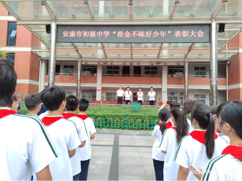 6月17日上午,安康市初級中學舉行了一場表彰大會。表彰我校初一四班景永強、汪正男、馬崇偉三位同學拾金不昧的行為,并為其頒發(fā)獎狀,引導全校師生學習這種拾金不昧的優(yōu)良品質(zhì),將傳統(tǒng)美德內(nèi)化于心,外化于行。