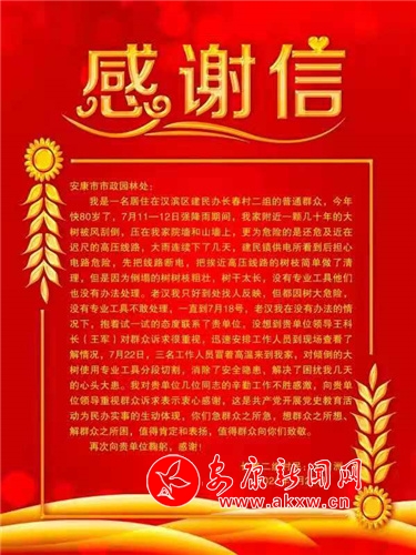 從感謝信中獲知:家住漢濱區(qū)建民辦長(zhǎng)春村二組的尤大爺年近八旬,因7月11—12日強(qiáng)降雨導(dǎo)致附近一棵幾十年的大樹被風(fēng)刮倒,壓在他家院墻和山墻上,更為危險(xiǎn)的還危及近在咫尺的高壓線路。供電部門對(duì)高壓線路的樹枝做了清理,但因倒塌大樹粗壯,樹干太長(zhǎng),沒有專業(yè)工具處理,仍存在較大安全隱患。老大爺突然想到曾在路邊看到市政人員對(duì)行道樹進(jìn)行修剪,于是抱著試試的心態(tài)撥打了安康市市政園林處電話。接到求助后,該處綠化管護(hù)科當(dāng)天下午派了2名專業(yè)人員趕往現(xiàn)場(chǎng),對(duì)該樹干進(jìn)行分段切割移除,解決了困擾老大爺?shù)男念^大患。老大爺對(duì)市政園林處及時(shí)高效辦理群眾煩心事、操心事非常感激,連夜寫信并通過快遞形式寄到市政園林處。一封感謝信只是市政園林處踐行開展黨史學(xué)習(xí)教育“我為群眾辦實(shí)事”主題實(shí)踐活動(dòng)的一個(gè)縮影。自黨史學(xué)習(xí)教育以來,市政園林處以學(xué)踐用,以學(xué)促干,累計(jì)為群眾辦實(shí)事11件,扎實(shí)推進(jìn)市政園林項(xiàng)目建設(shè),社區(qū)群眾自發(fā)送來錦旗2面,各級(jí)媒體爭(zhēng)相報(bào)道。