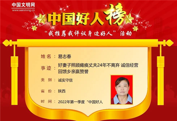 2022年第一季度“中國好人榜”發(fā)布儀式暨全國道德模范與身邊好人現(xiàn)場交流活動,于5月30日下午3點,以“云”發(fā)布方式舉行,安康市易志春榮登“誠實守信好人榜”。