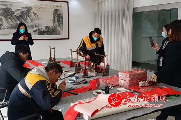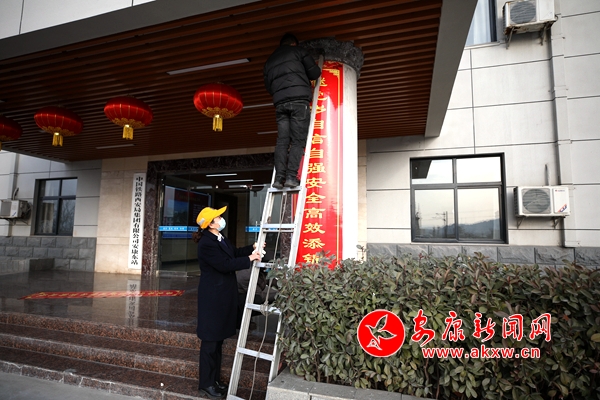 圖為該站干部職工在機(jī)關(guān)樓下貼春聯(lián)Wfj安康新聞網(wǎng)
