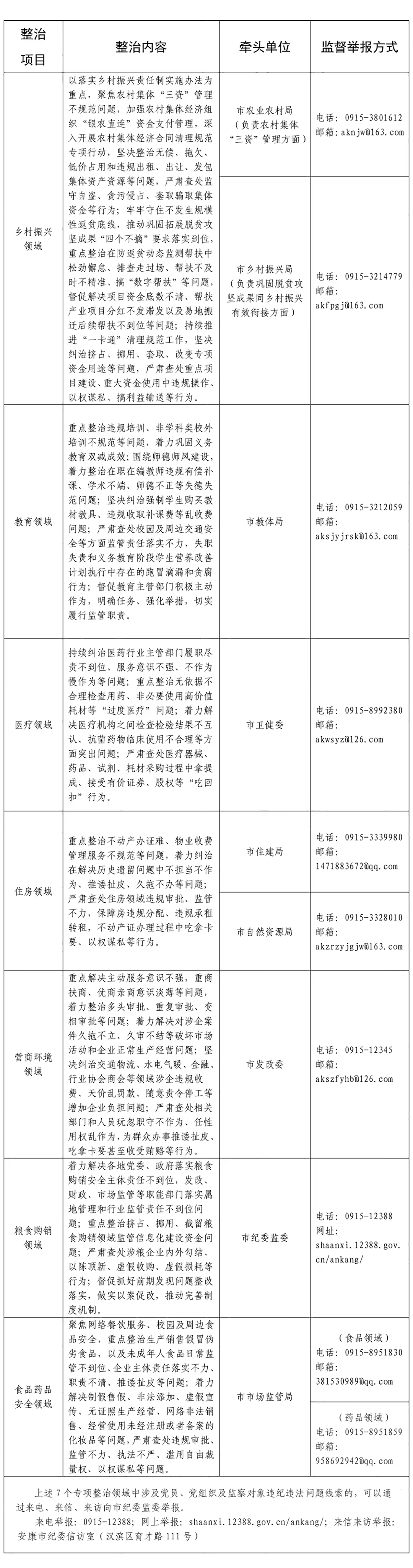 為充分發(fā)揮群眾監(jiān)督作用,持續(xù)深入開展群眾身邊腐敗和作風(fēng)問題專項(xiàng)整治,現(xiàn)將2023年全市專項(xiàng)整治內(nèi)容及監(jiān)督舉報(bào)方式公布如下: p4t安康新聞網(wǎng)