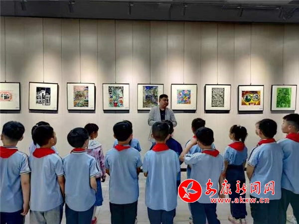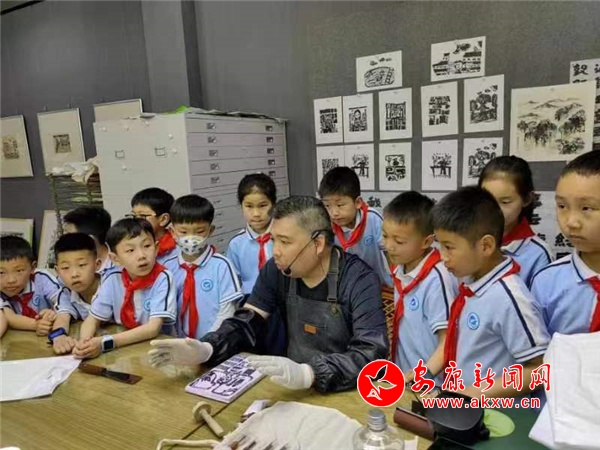 師生們在群藝館老師帶領(lǐng)下觀摩了“藝橋飛架童心筑夢”蘇陜豫三省三地少兒版畫展,一幅幅精品佳作,表現(xiàn)出童心、童趣,弘揚著中華優(yōu)秀傳統(tǒng)文化,培育和踐行社會主義核心價值觀,傳遞著新時代少年兒童心中的美好心愿和遠大夢想,讓同學(xué)們心中種下了一顆藝術(shù)的種子。緊接著同學(xué)們來到版畫工坊,實地參觀專業(yè)老師版畫制作過程,從專業(yè)老師的制作中,明白了一張版畫是如何誕生的。