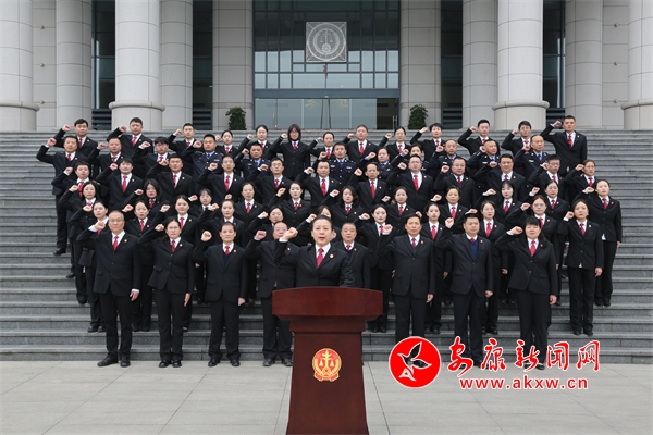 上午10時(shí),在莊嚴(yán)的國(guó)歌聲中,四名法警正步護(hù)送國(guó)旗入場(chǎng)。隨后,院長(zhǎng)劉娟走向領(lǐng)誓臺(tái),左手撫按憲法,右手舉拳,領(lǐng)誦誓詞。全體班子成員、法官干警共67人高舉右拳,以錚錚誓言許下對(duì)憲法的忠誠(chéng)和對(duì)人民的莊嚴(yán)承諾。