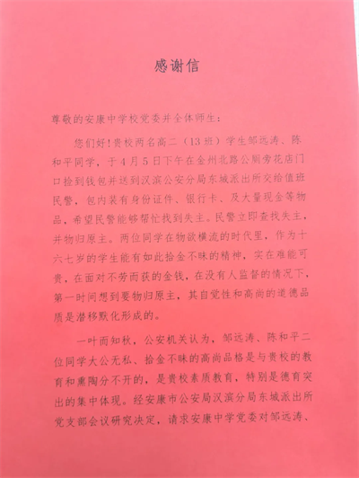 據(jù)悉,安康中學(xué)高二13班鄒遠濤、陳和平同學(xué)于4月5日下午在金州北路撿到裝有身份證件、銀行卡及大量現(xiàn)金的錢包后,積極上交公安機關(guān)并協(xié)助尋找失主。經(jīng)公安機關(guān)查找,迅速將錢包物歸原主。4月8日,漢濱分局東城派出所黨支部送來了感謝信,表揚兩位同學(xué)的高尚行為。