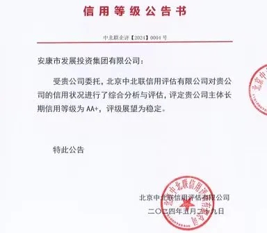 近日,經(jīng)過北京中北聯(lián)信用評估有限公司綜合評定,安康市發(fā)展投資集團(tuán)有限公司成功獲評AA+主體信用等級,評級展望為“穩(wěn)定”,成為我市乃至陜南地區(qū)首家獲得AA+主體信用評級的市屬國有企業(yè)。此次評級成功通過,是市委市政府全面推動“以市帶縣”整合效應(yīng)的釋放,也是資本市場、信用機(jī)構(gòu)對我市經(jīng)濟(jì)社會發(fā)展水平和集團(tuán)公司發(fā)展后勁的充分認(rèn)同和肯定,將為進(jìn)一步拓寬融資渠道、提高融資能力和降低融資成本創(chuàng)造有利條件。
