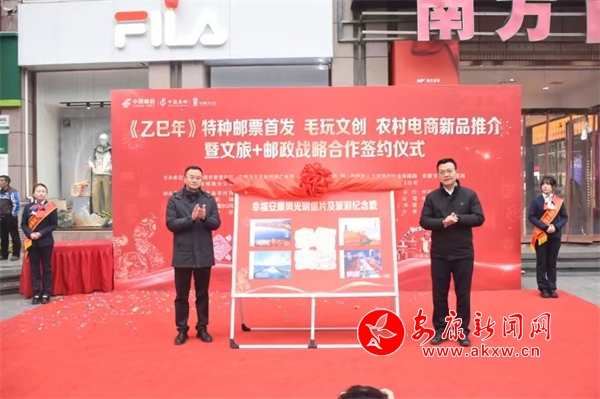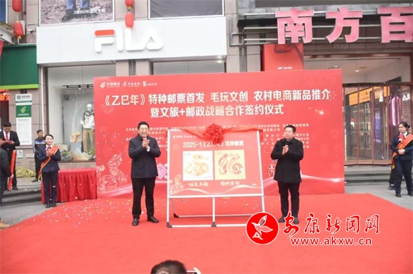 本網(wǎng)訊(通訊員 沈巧苗)龍騰辭舊歲,巳蛇報(bào)春來,1月5日上午9點(diǎn),《乙巳年》特種郵票首發(fā)、生肖毛玩文創(chuàng)、農(nóng)村電商新品推介暨文旅+郵政戰(zhàn)略合作簽約活動(dòng)舉辦,現(xiàn)場參加活動(dòng)人達(dá)300余人。