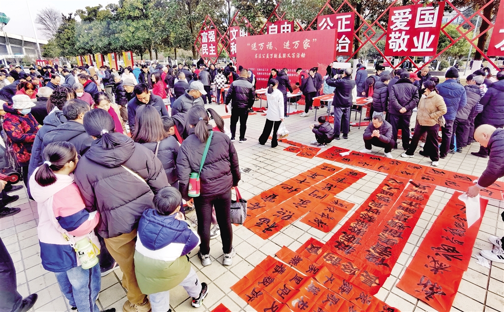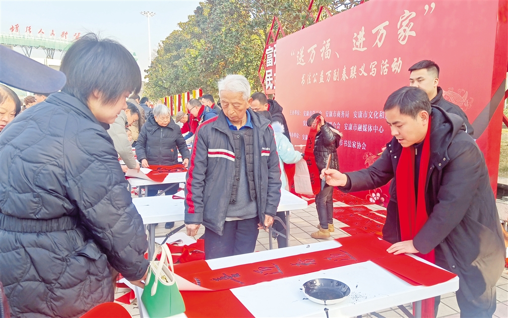 活動(dòng)現(xiàn)場(chǎng),人頭攢動(dòng),長桌一字?jǐn)[開,書法家們精神飽滿,手中的毛筆飽蘸濃墨,筆鋒游走間,楷、行、隸、草等多種書體各顯神韻,一副副滿載祝福的春聯(lián)、一張張承載希望的“福”字躍然紙上,飽含著濃濃年味兒,寄托著人們對(duì)新年的美好憧憬與希望。前來領(lǐng)取春聯(lián)的市民絡(luò)繹不絕,大家一邊欣賞書法創(chuàng)作,一邊挑選著心儀的春聯(lián)內(nèi)容,現(xiàn)場(chǎng)氣氛熱烈融洽。活動(dòng)還將在安康高新區(qū)、西城坊、部分旅游景點(diǎn)等地持續(xù)進(jìn)行。(記者 陸青波 攝)