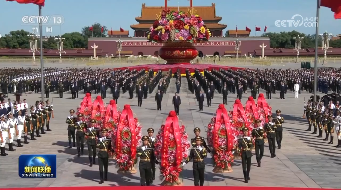 方陣前,以中共中央,全國(guó)人大常委會(huì),國(guó)務(wù)院,全國(guó)政協(xié),中央軍委,各民主黨派、全國(guó)工商聯(lián)和無(wú)黨派愛(ài)國(guó)人士,各人民團(tuán)體和各界群眾,老戰(zhàn)士、老同志和烈士親屬,中國(guó)少年先鋒隊(duì)名義敬獻(xiàn)的9個(gè)大型花籃一字排開(kāi),花籃紅色緞帶上書(shū)寫(xiě)的“人民英雄永垂不朽”格外醒目。