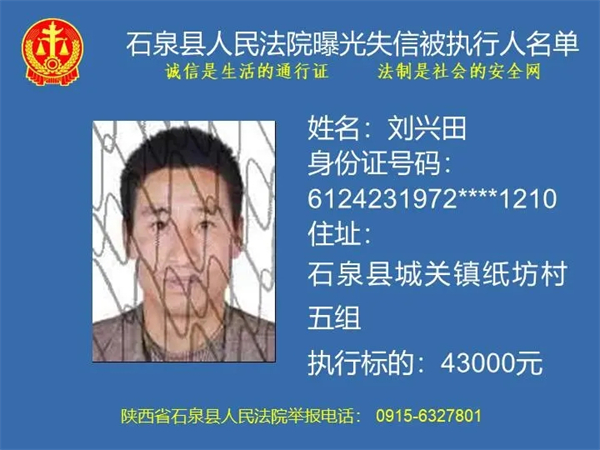 為了進(jìn)一步加大執(zhí)行力度,保障勝訴當(dāng)事人的合法權(quán)益,推進(jìn)社會(huì)誠(chéng)信體系建設(shè),依照《中華人民共和國(guó)民事訴訟法》《最高人民法院關(guān)于公布失信被執(zhí)行人名單信息的若干規(guī)定》等法律、司法解釋的有關(guān)規(guī)定,現(xiàn)對(duì)一批已進(jìn)入執(zhí)行程序,且尚未全部履行義務(wù)的被執(zhí)行人進(jìn)行媒體曝光,歡迎廣大群眾支持石泉縣人民法院的工作,向我院提供被執(zhí)行人的財(cái)產(chǎn)線索,使生效法律文書能夠得到切實(shí)執(zhí)行,讓人民群眾切實(shí)感受到公平正義就在身邊。