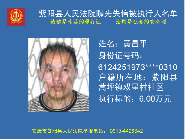 被執(zhí)行人黃昌平,你因不履行(2017)陜0924民初241號(hào)民事判決書確定的義務(wù),已被紫陽縣人民法院納入失信被執(zhí)行人名單庫依法進(jìn)行信用懲戒。信用懲戒范圍包括但不限于以下措施: